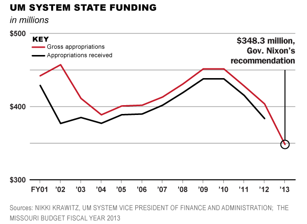 This graphic shows the frightening decline of state support over the last decade and couple this with record enrollments for every year shown in the graphic. A $55 million reduction in funding for the UM System, a 13.7 percent decrease from fiscal year 2012’s gross appropriations. (Graphic credit to Nicole Thompson)