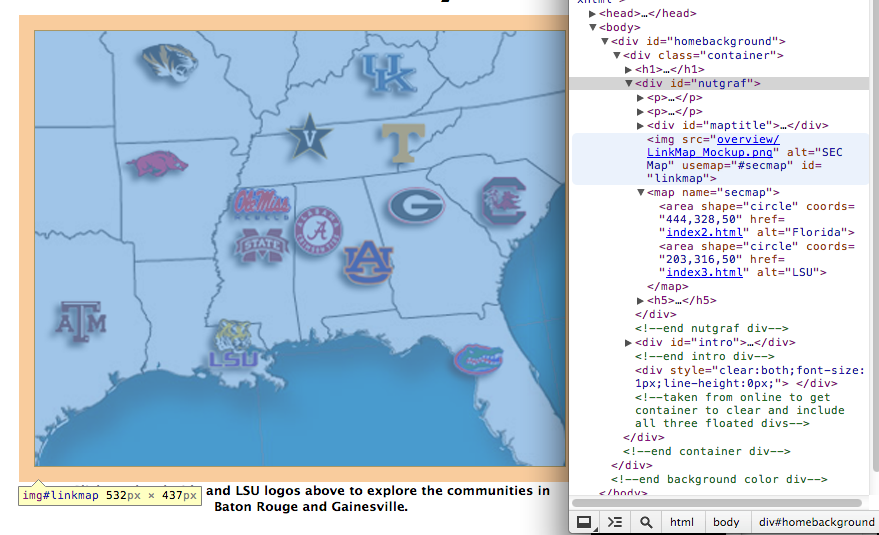 My favorite part of the site is an old-school HTML technique, called an image map, that I used as navigation to the individual schools’ profiles from the splash page. Basically, the code identifies certain areas of an image file (this time a map of SEC schools I created) clickable. By identifying the X and Y coordinates of the LSU Tiger and UF Gator logos, I was able to create a circular area with a radius of 50 pixels that essentially makes each logo a button to link you to each profile.